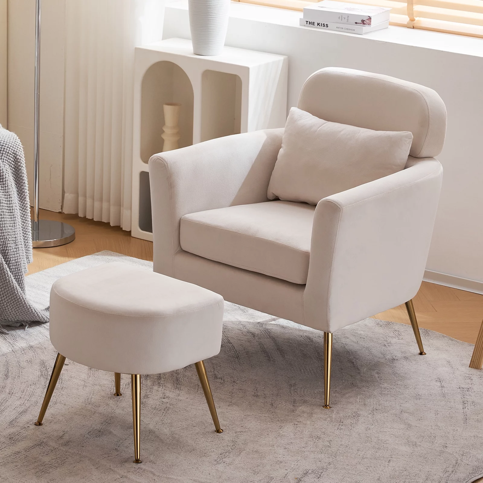 Ktaxon Accent Chair with Ottoman Set, Flannel Upholstered Single Sofa with Lumber Pillow Armchair with Armrests and Footrest for Bedroom Living Reading Room Office Beige