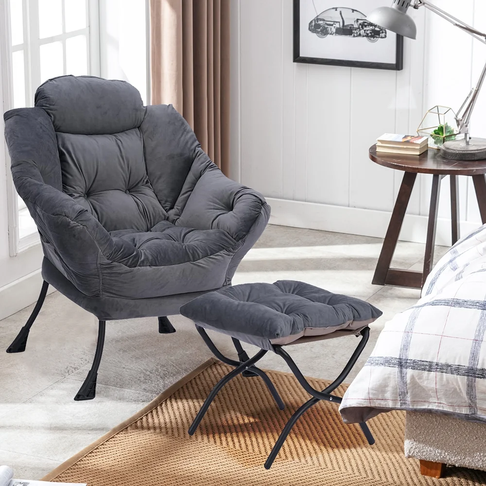Lemacte Modern Fabric Lazy Chair and Folding Footrest Stool Seats Set, Accent Contemporary Lounge Chair and Portable Ottoman, Steel Frame Leisure Sofa Chair and Cotton Anti-Slip Footstool