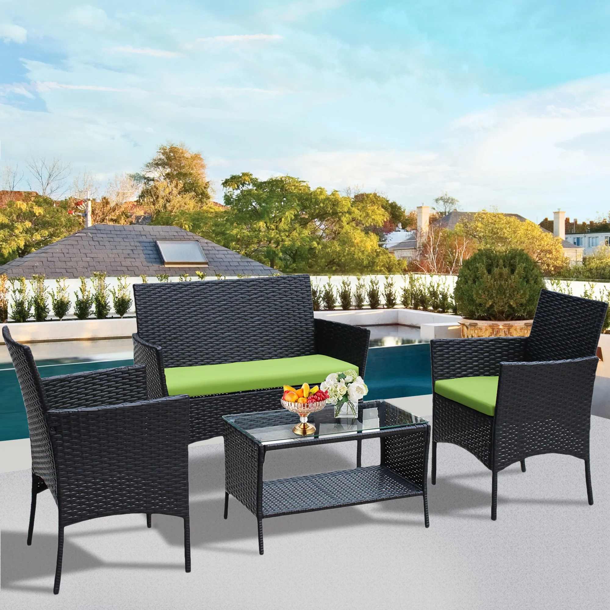 New Outdoor Patio Furniture Set 4pcs, Seizeen All-Weather PE Rattan Conversation Set w/2-Tier table, Loveseat Cushioned Outdoor Furniture Sofa for Yard, Porch, Garden, Deck, Green Cushions