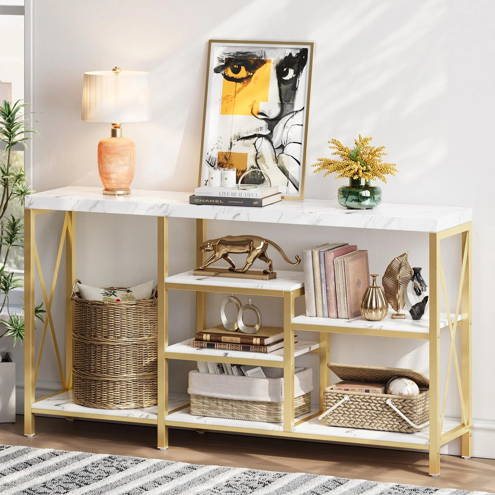 Relefree 55 in Console Table, Modern Entryway Table with Storage, Faux Marble Sofa Table for Living Room, Bedroom, Hallway, White/Gold