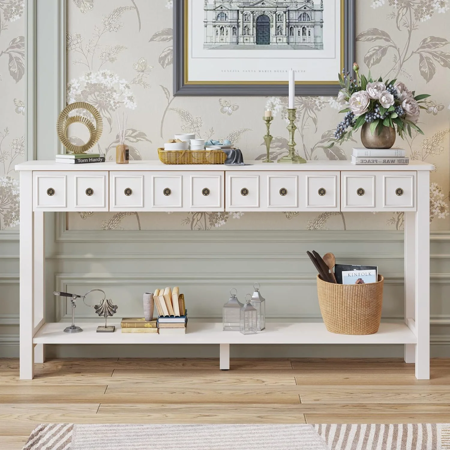 Royard Oaktree Console Table Extra Long Entryway Table with 4 Drawers and Storage Shelf Retro Accent Sofa Table for Living Room, Entryway, Hallway,White