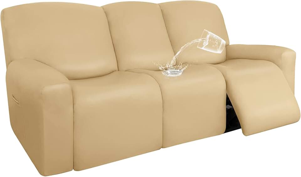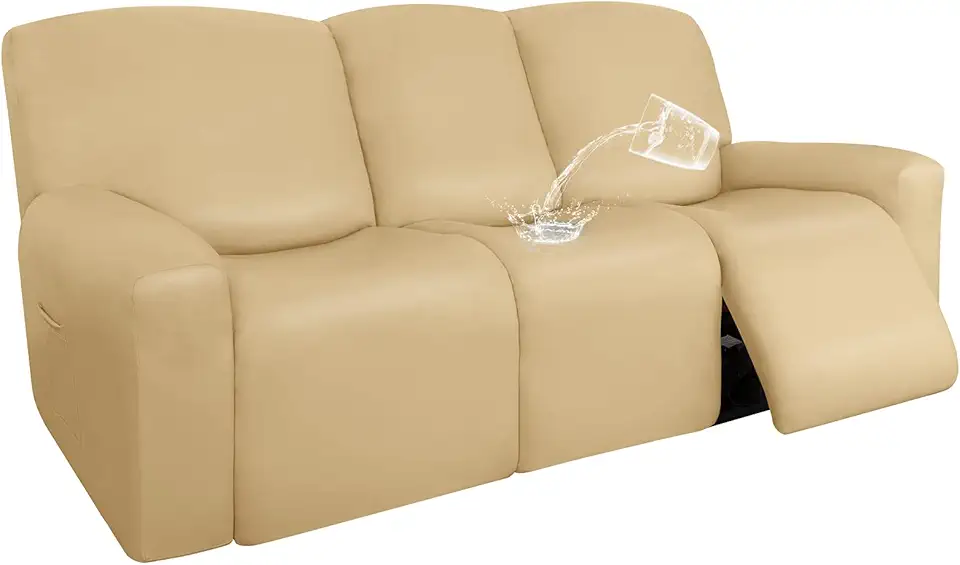 Easy-Going PU Leather Recliner Sofa Slipcovers, Waterproof Stretch Sofa Covers, 8 Pieces Stretch Furniture Protector, Elastic Strap Shield Pets Kids Children Cats Dogs Beige