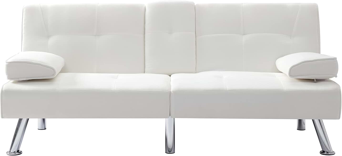 Synthetic Leather Cushion Modern Convertible futon, Adjustable Folding Sofa Bed, Guest Room Bed with Detachable armrests, Two Cup Holders, Metal Legs (Polyester Blend, Beige)