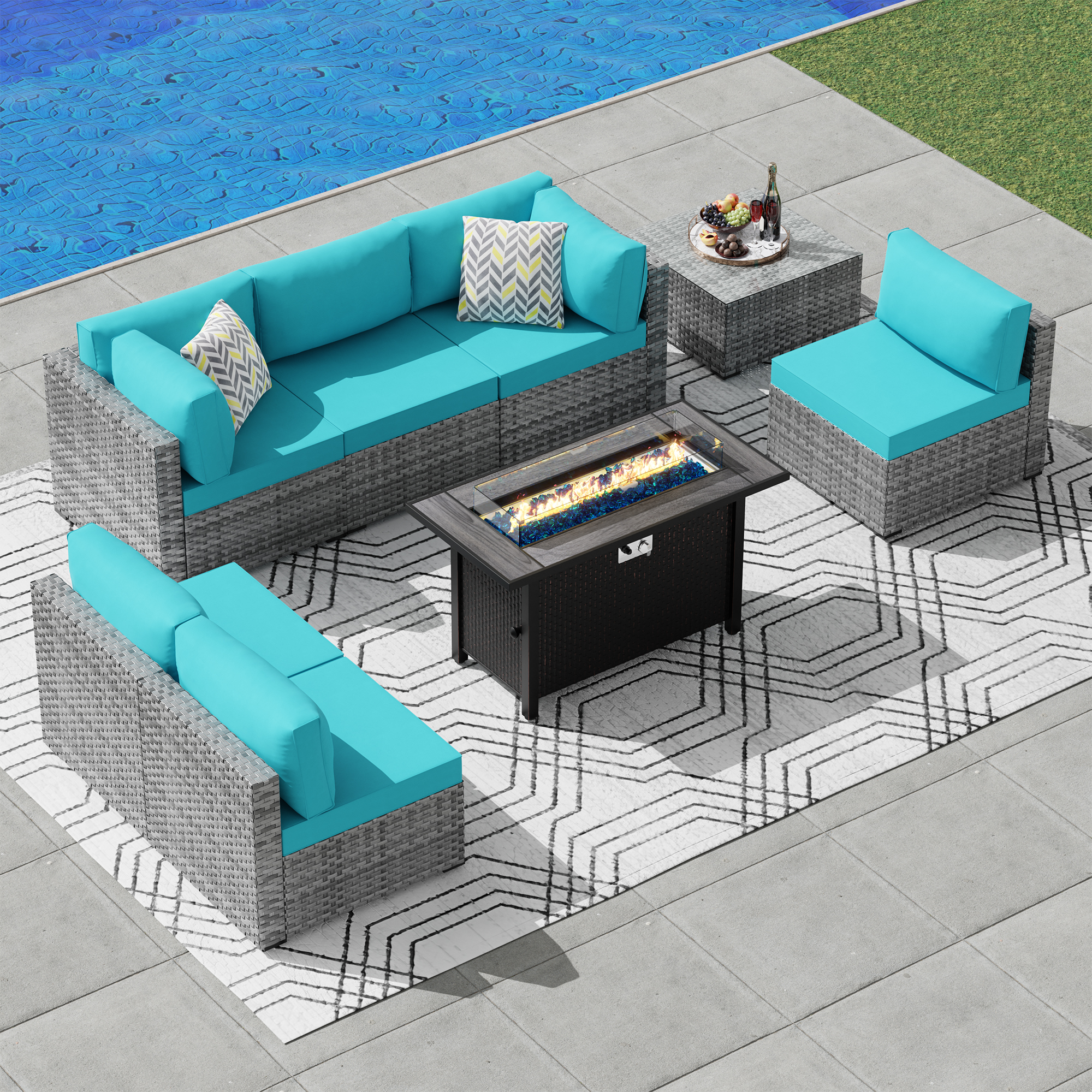 Walsunny 8 PCS Patio Furniture Set with 45" 50000BTU Gas Propane Fire Pit Table, All Weather PE Wicker Rattan Patio Conversation Sofa Silver Rattan/Blue