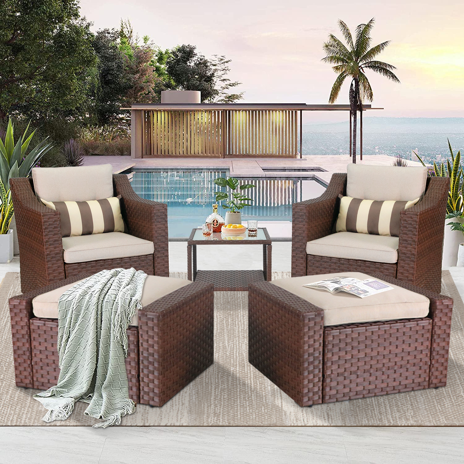 SUNCROWN 5-Piece Outdoor Patio Conversation Set Wicker Furniture Sofa Set with Table and Ottomans, Brown
