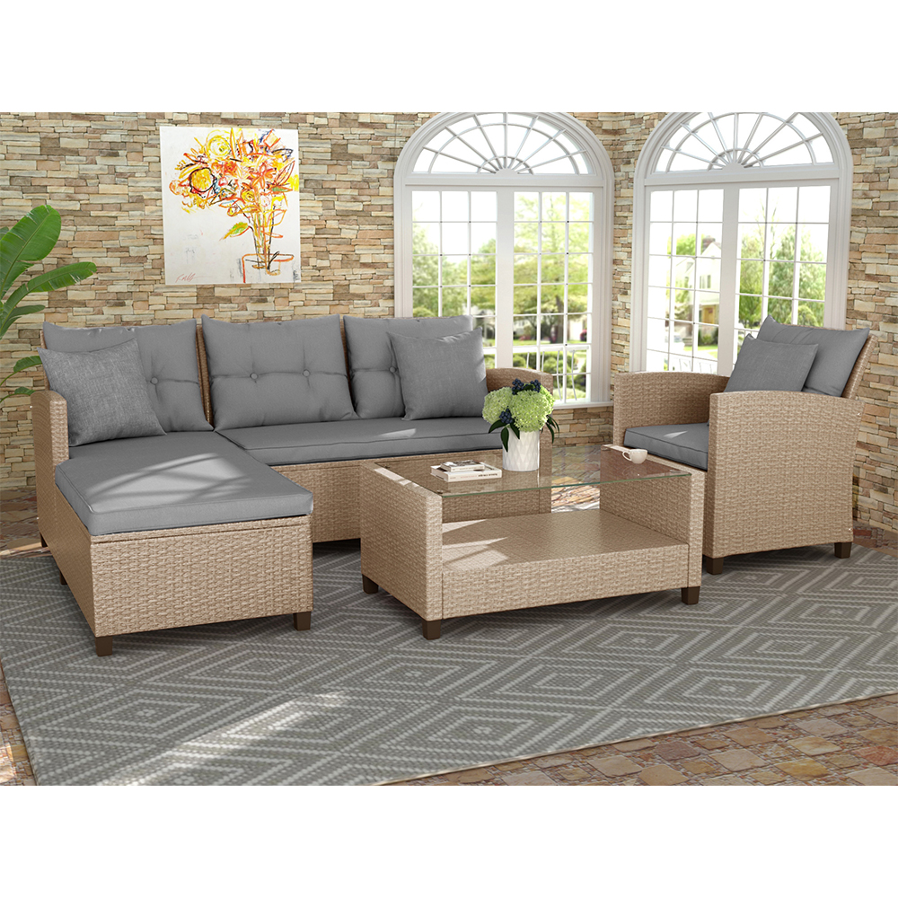 Devoko 4 Pieces Patio Conversation Set PE Rattan Wicker Furniture Sofa Set Furniture Set, Beige