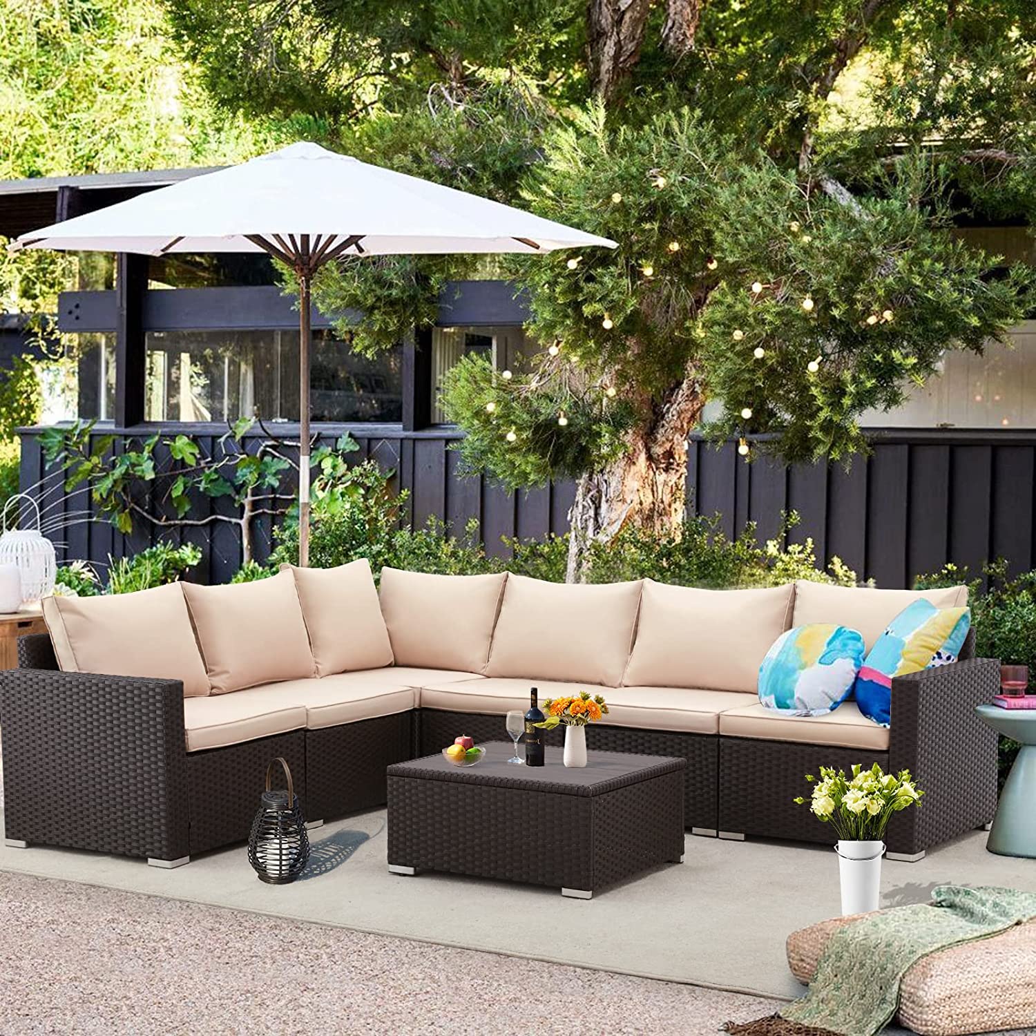 7 Pieces Outdoor Conversation Furniture Set All Weather PE Wicker Patio Furniture Sofa Set Outdoor Sectional Sofa Set with Khaki Cushions and Coffee Table