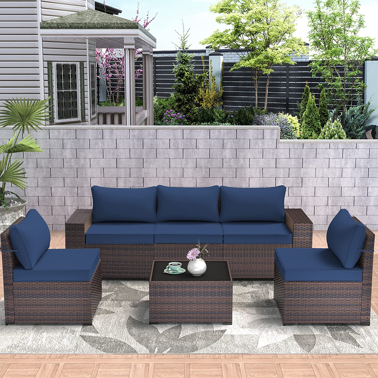 Kullavik 6 Pieces Outdoor Patio Furniture Set with Coffee Table and Seat Cushion PE Wicker Rattan Sectional Sofa Patio Conversation Set,Navy Blue