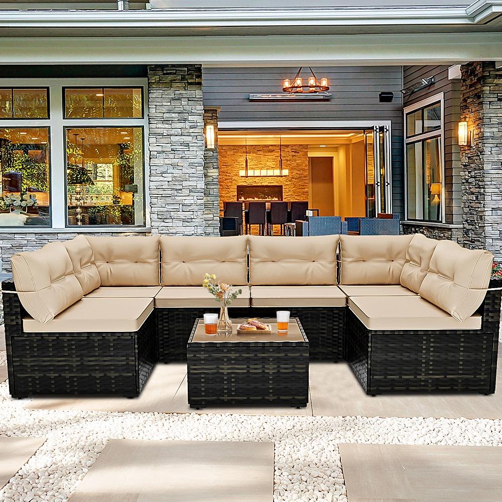 7 Piece Rattan Sectional Sofa Set, Outdoor Conversation Set, All-Weather Wicker Sectional Seating Group with Cushions & Coffee Table, Morden Furniture Couch Set for Patio Deck Garden Pool
