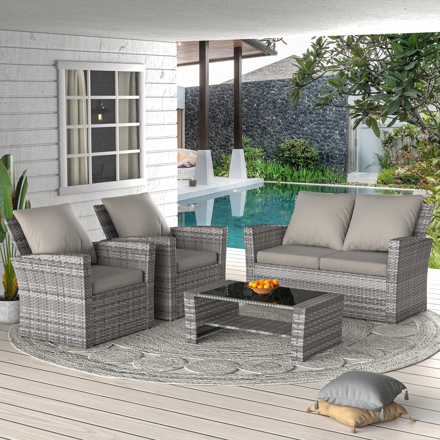 Highsound 4 Piece Outdoor Patio Furniture Sets, Wicker Conversation Set for Porch Deck, Gray Rattan Sofa Chair with Cushions & Coffee Table
