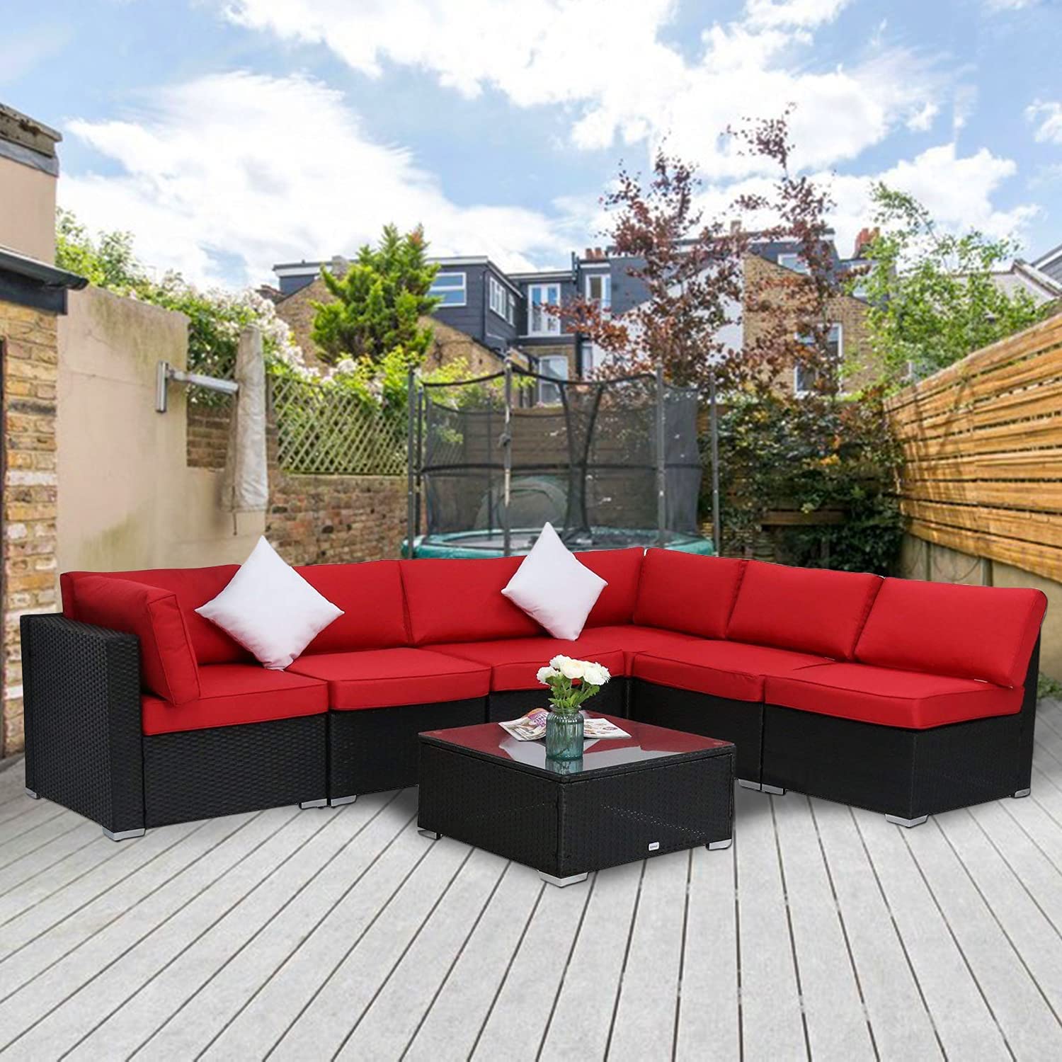 Kinbor 7pcs Outdoor Patio Furniture Set Wicker Sectional Sofa W/ Side Table Patio Rattan Conversation Chair Sofa Set Red