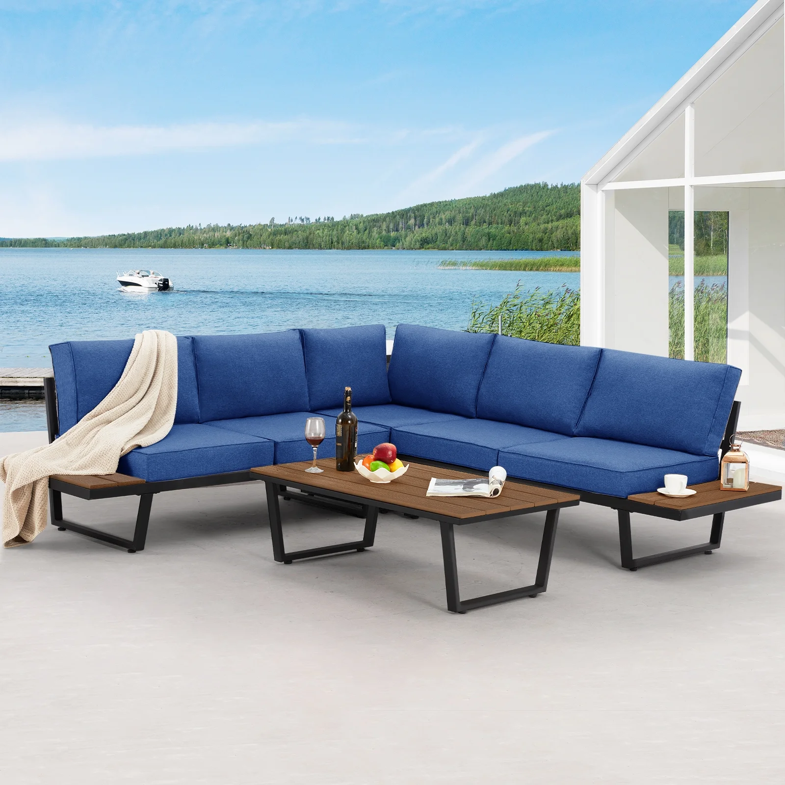 Richryce Outdoor Conversation Set 4pcs L-Shaped Metal Sectional Sofa Set with Coffee Table for Patio Navy Blue