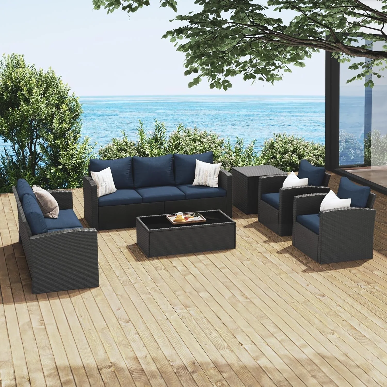 Royalcarft 7 Pieces Outdoor Patio Furniture Sets Wicker Sectional Sofa All-Weather PE Rattan Conversation Sets,Dark Blue