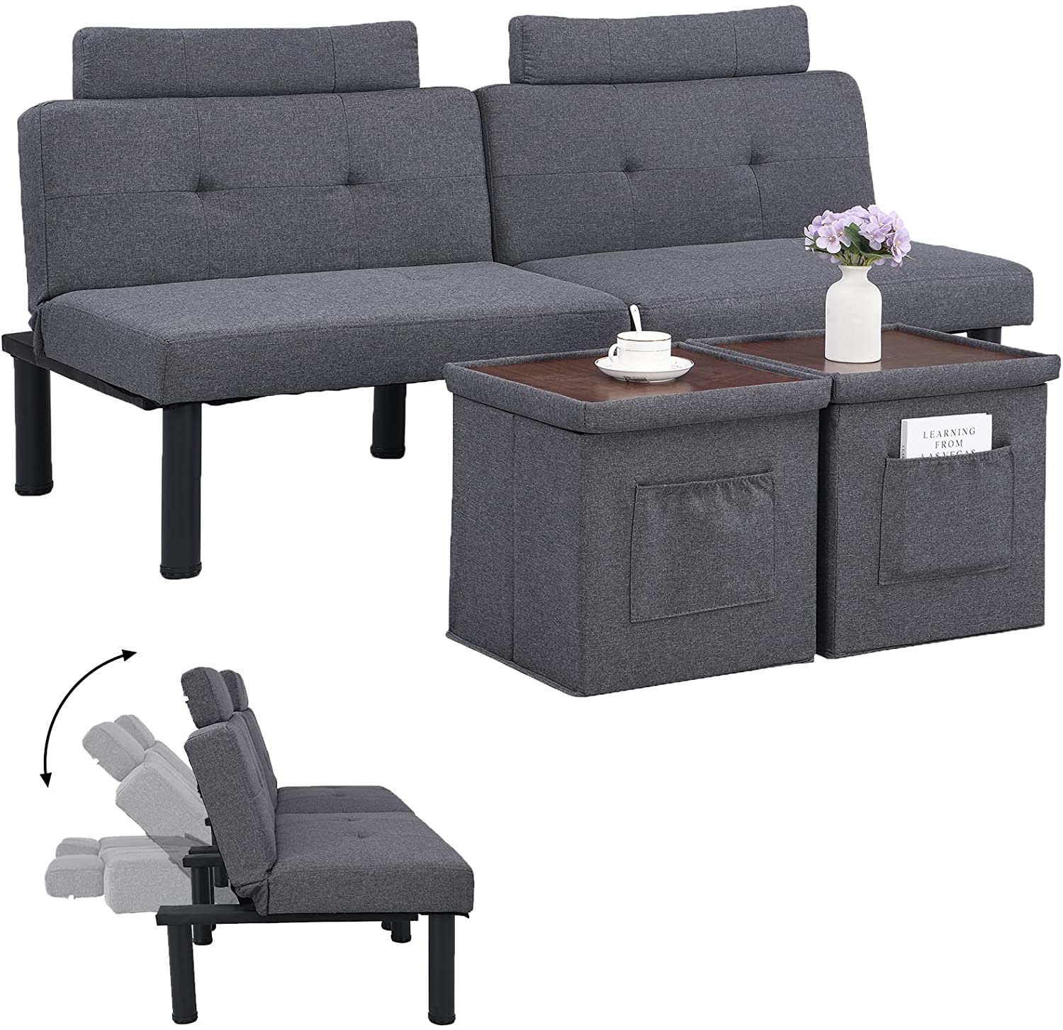 IPKIG Convertible Futon Sofa Bed with Two Storage Ottoman/Coffee Table, Folding Loveseat Sleeper, Small Futon Couch for Compact Living Space, Apartment, Dorm, Bedroom, 3 Angles/Metal Legs (Grey)