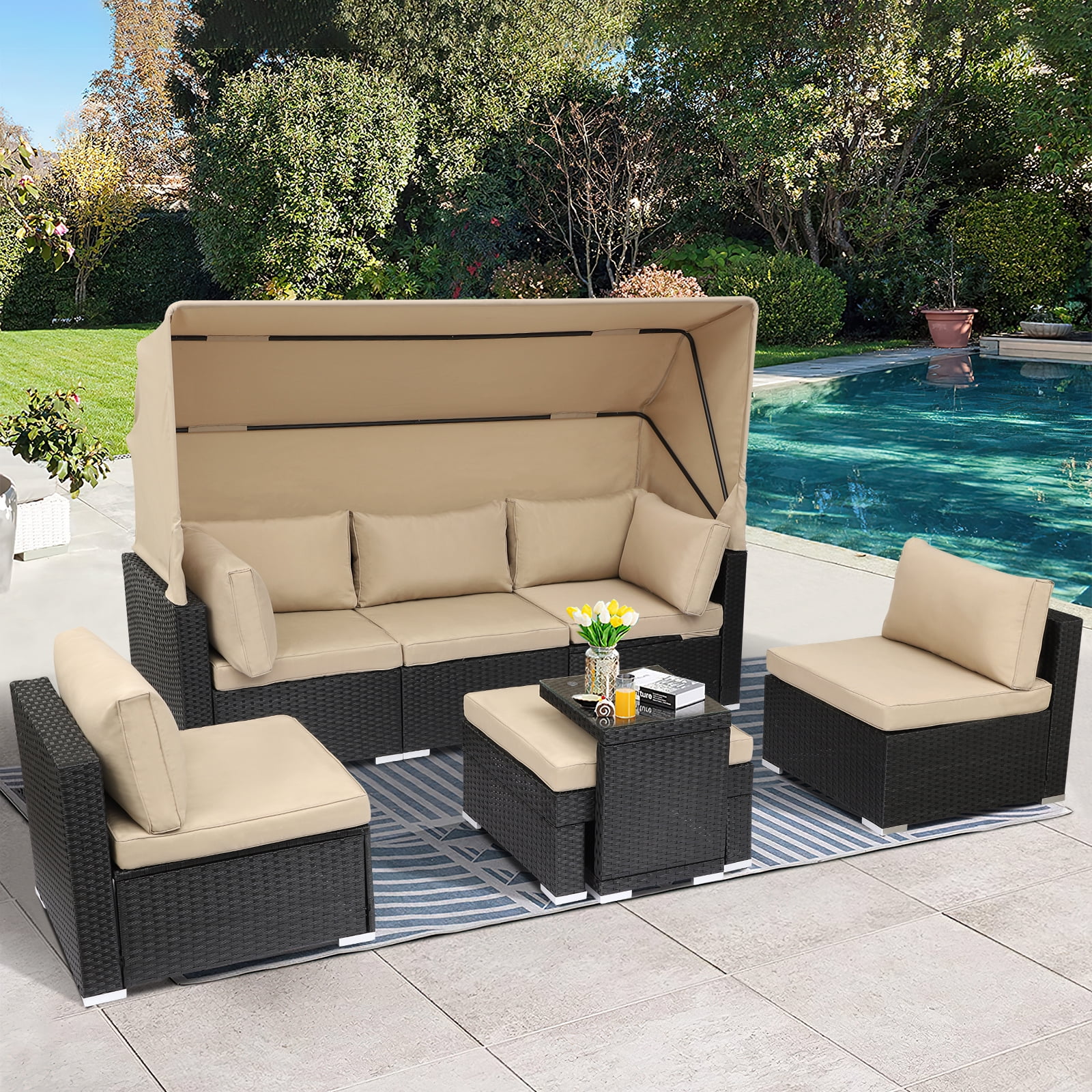 Magic Union 7 Pieces Patio Furniture Sets Daybed with Retractable Canopy, Outdoor Rattan Sectional Sofa Set(Khaki)