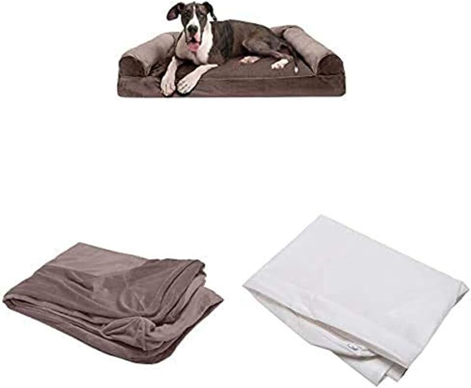 Furhaven Pet Bundle - Jumbo Plus Driftwood Brown Memory Foam Faux Fur & Velvet Sofa, Extra Dog Bed Cover, & Water-Resistant Mattress Liner for Dogs & Cats