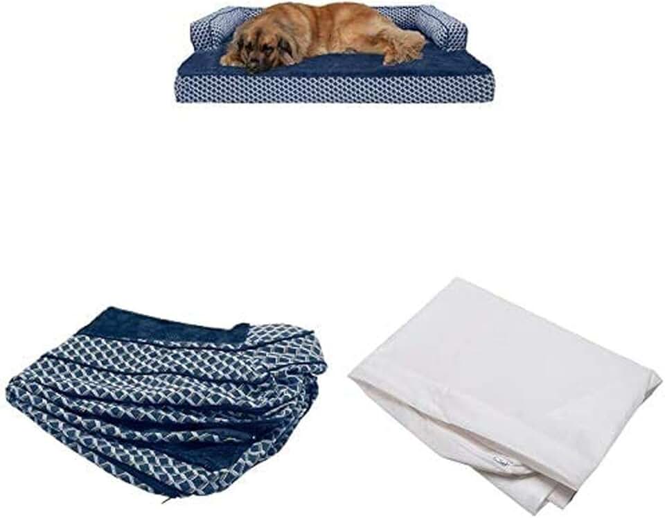 Furhaven Pet Bundle - Jumbo Plus Diamond Blue Cooling Gel Memory Foam Plush Faux Fur & Décor Comfy Couch Sofa, Extra Dog Bed Cover, & Water-Resistant Mattress Liner for Dogs & Cats