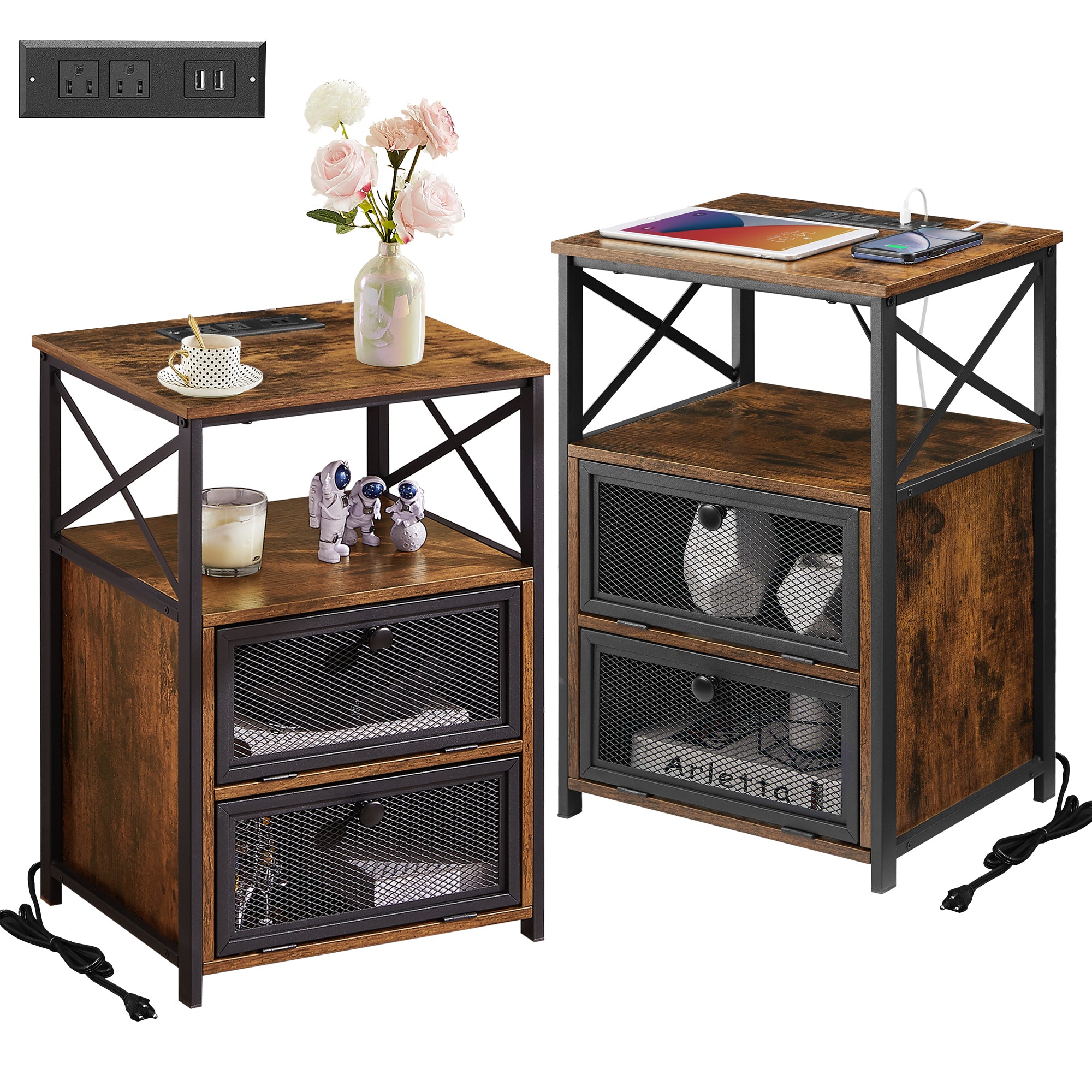 VECELO Set of 2 Nightstand with Charging Station & 2 Flip Drawers, Sofa Side End Table for Bedroom, Living Room, 2 USB Ports & 2 Power Outlet, Brown