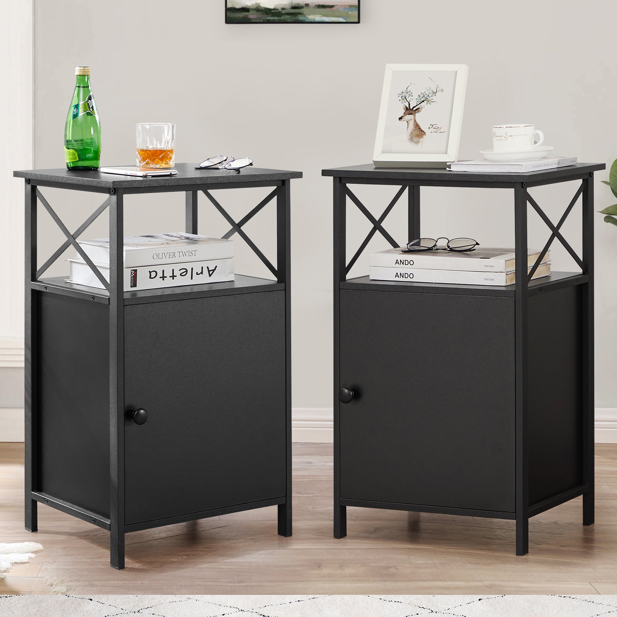 VECELO Set of 2 End Table with Storage Cabinet, Nightstand Sofa Bedside Table for Living Room, Bedroom, Office, Black