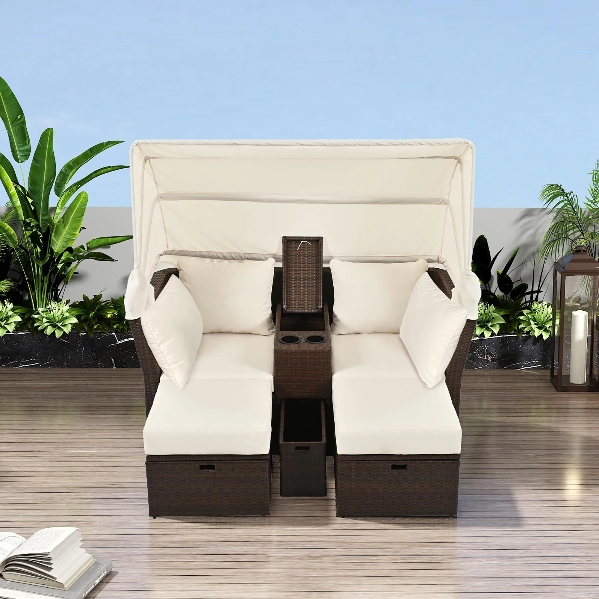 Merax 2-Seater Patio Double Daybed Outdoor Loveseat Sofa Set with Foldable Awning and Cushions for Garden, Balcony, Poolside, Beige C25