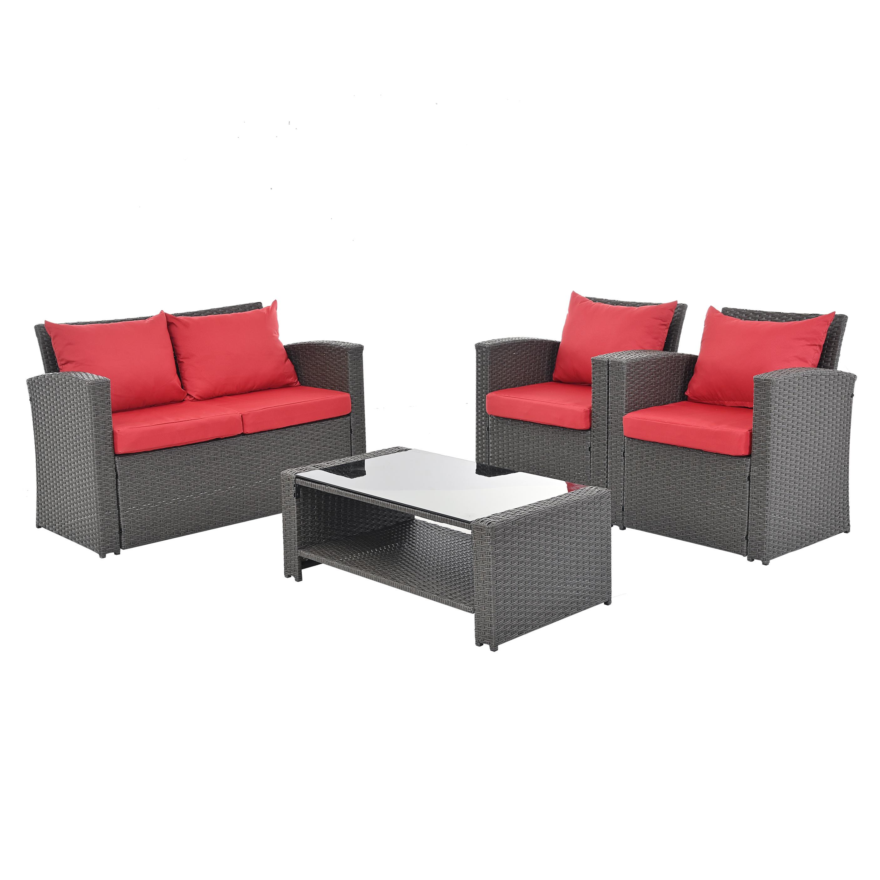 4 Piece Patio Sofa Conversation Set, Rattan Patio Chair Outdoor Furniture Set, Gray Wicker Sofa Set with Coffee Table and Gray Cushion for Backyard Lawn Garden Poolside Balcony