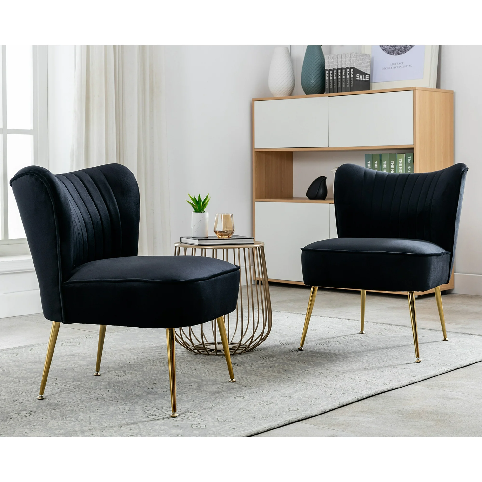 Guyou Modern Accent Chair Set of 2, Armless Slipper Chair Velvet Upholstered Lounge Chair, Wingback Large Single Sofa Side Chair with Gold Legs for Living Room Bedroom, Black