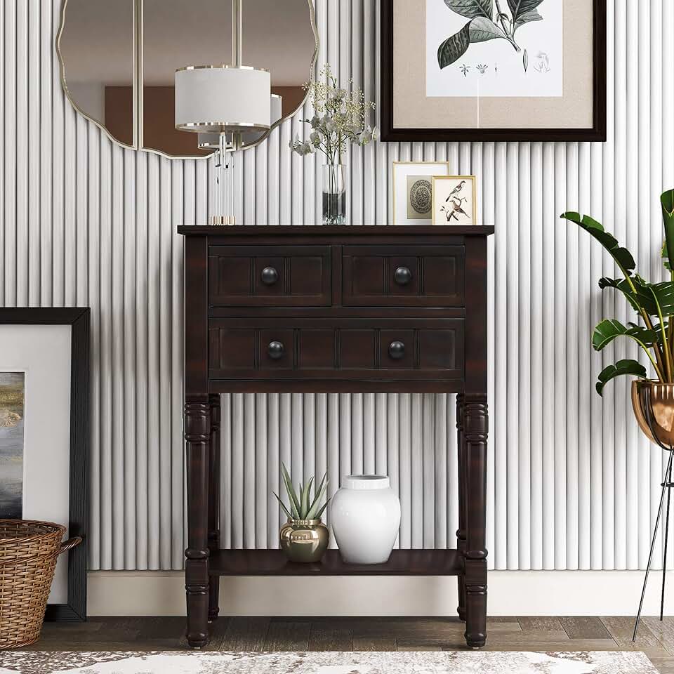 Narrow Console Table, Slim Sofa Table with Three Storage Drawers and Bottom Shelf for Living Room, Easy Assembly (Espresso)