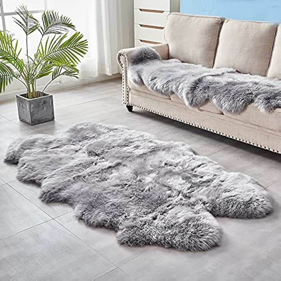 HUAHOO Premium Genuine Sheepskin Rug Grey Real Australia Sheepskin Natural Luxury Fluffy Lambskin Fur Area Rug Seat Covers for Kids Bedroom Sofa Chair Cover Quarto Pelt/4' x 6' Silver Grey