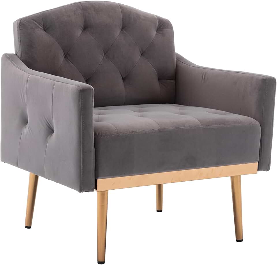 Olela Velvet Accent Chair with Arms for Living Room, Modern Tufted Single Sofa Armchair with Gold Metal Legs Upholstered Reading Club Chair for Bedroom Office Decorative (Grey - Velvet Curved Back)