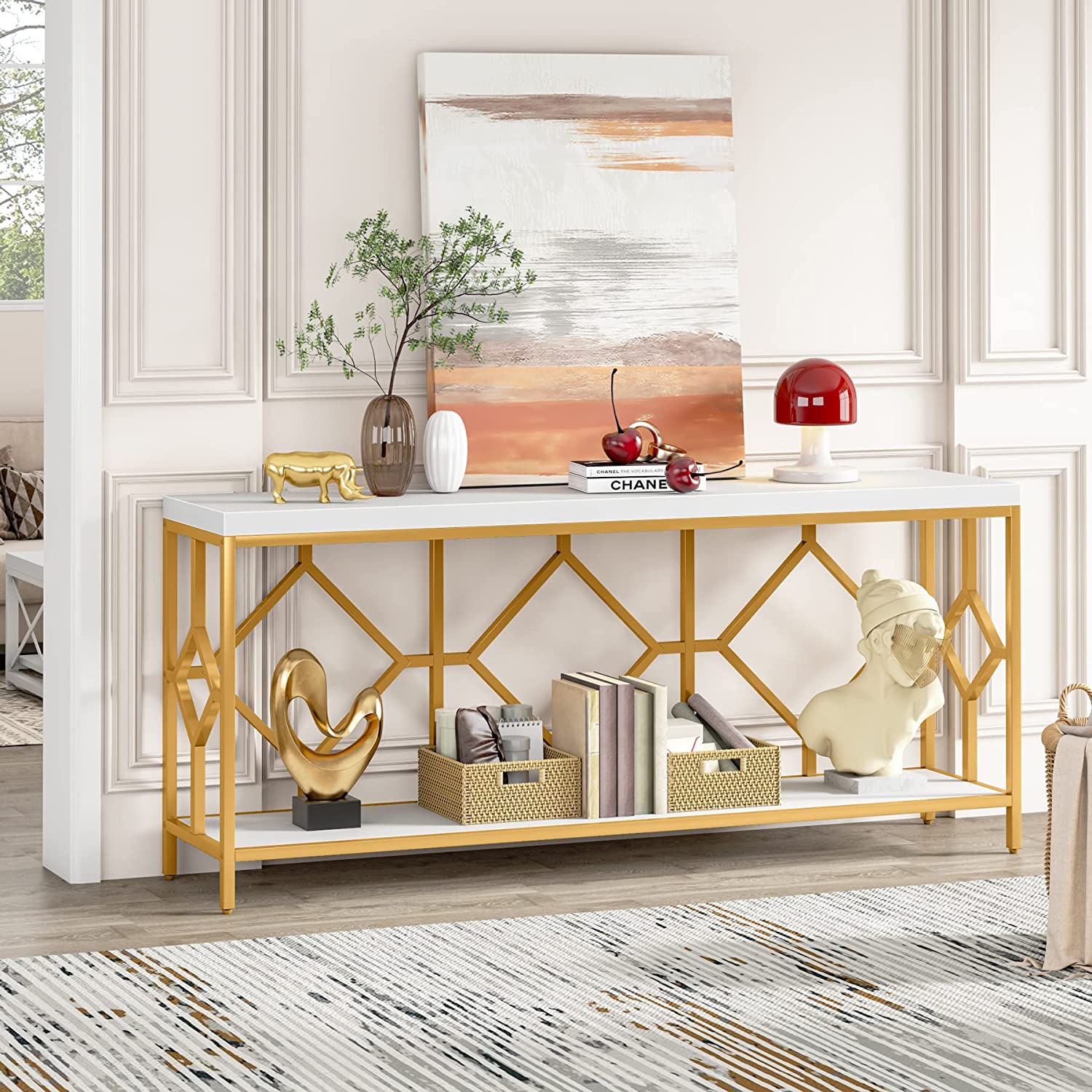 71 Inch Extra Long Console Table, Modern Narrow Sofa Table Entry Table Behind Couch Table with Open Storage Shelf for Entryway Hallway Living Room (White & Gold)