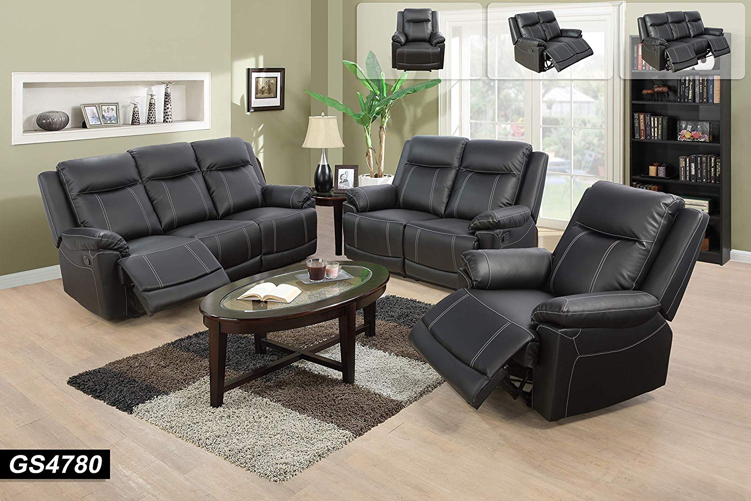 Ponliving Furniture 3-Pieces Reclining Living Room Sofa Set, Bonded Leather ,Black