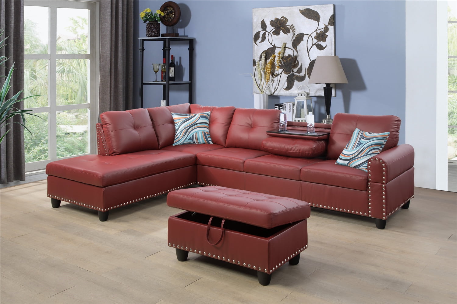 Pon Living 97.2" W Red Faux Leather Sectional Couch, L Shape Sectional Sofa with Ottoman