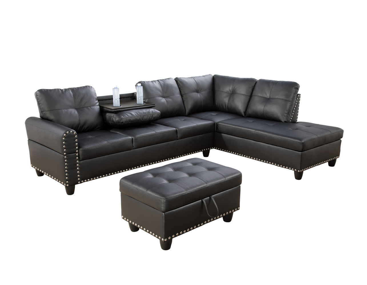 PonLiving Furniture Room Sectional Set, Leather Sectional Sofa in Home, with Storage Ottoman and Matching Pillows Right Hand Facing Black