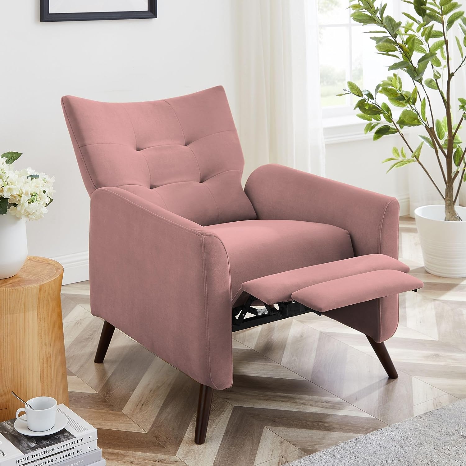 High Quality Upholstery Velvet Reclining Chair Push Back Reclining Sofa Chair with Solid Wood Legs, Comfy Armchair for Reading Living Room Bedroom(Rose)