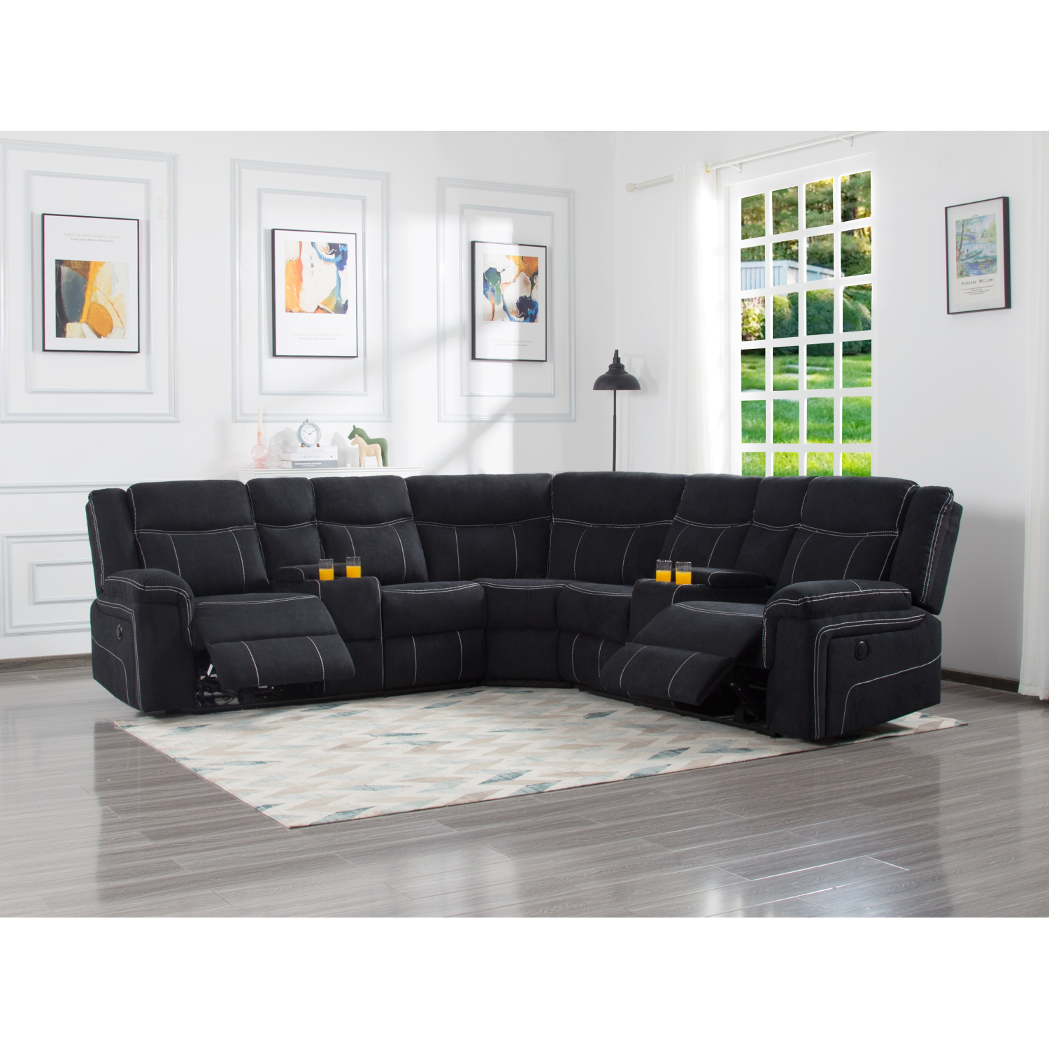 Spacious 107.5'' Power Reclining Sectional Sofa - Contemporary Black Design - Polyester Blend Material - Comfortable Seating for 5 - Built-in Cup Holders and Storage - Easy Assembly and Stylish