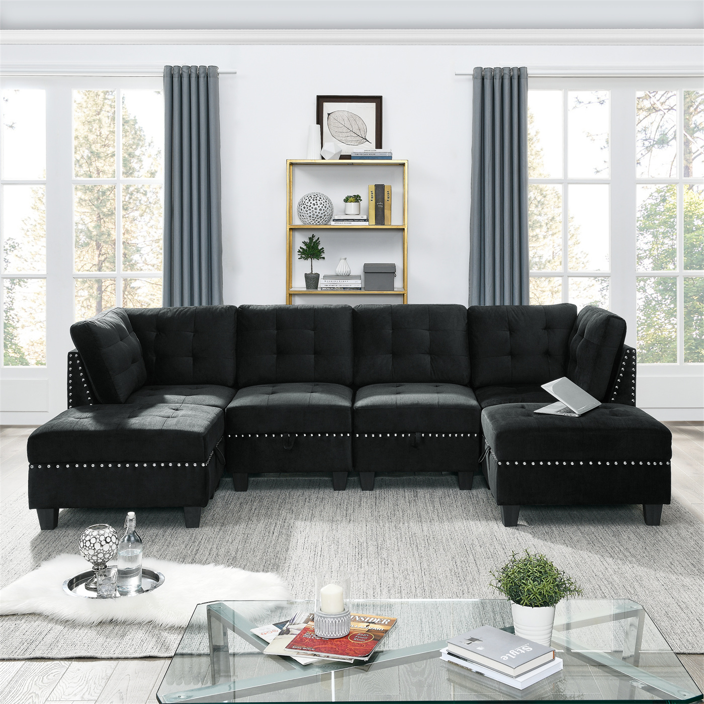 Velvet Sectional Couch with Storage for Liivng Room, Modular Sofa with Two Single Chair, Two Corner and Two Ottoman, Upholstered Sofa with Nail Head Trim