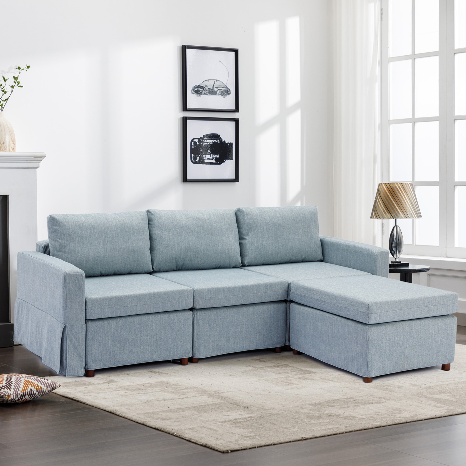 Modern Living Room 3-Seat Linen Sectional Sofa Couch with Ottoman, Light Blue, Removable & Washable Cushions - Chic and Functional Home Decor