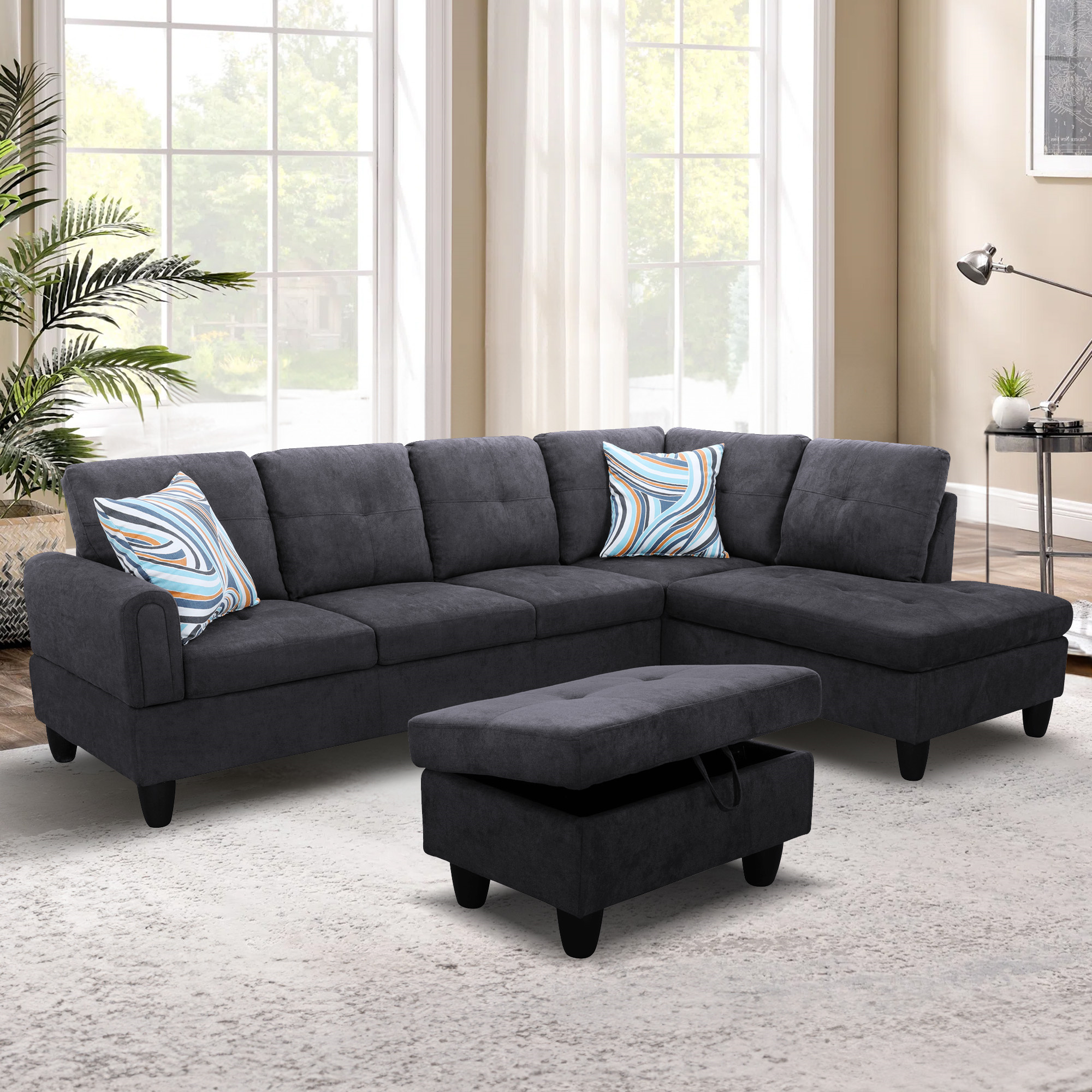 Aukfa 98" Sectional Sofa for Living Room, Couch with Storage Ottoman, Right Facing Chaise, Dark Gray