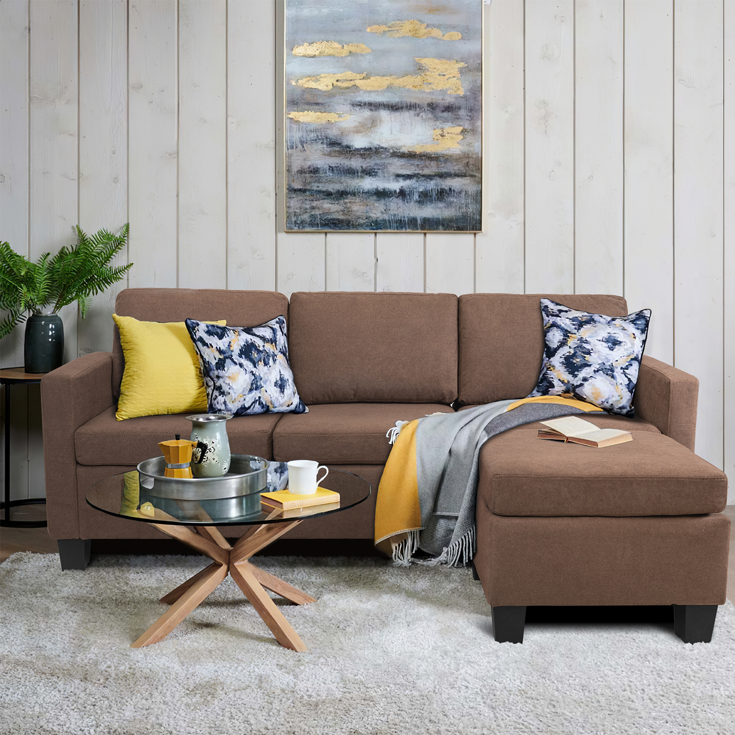 Vineego Linen Fabric L-shape Sofa Sectional Couch for Living Room, Brown