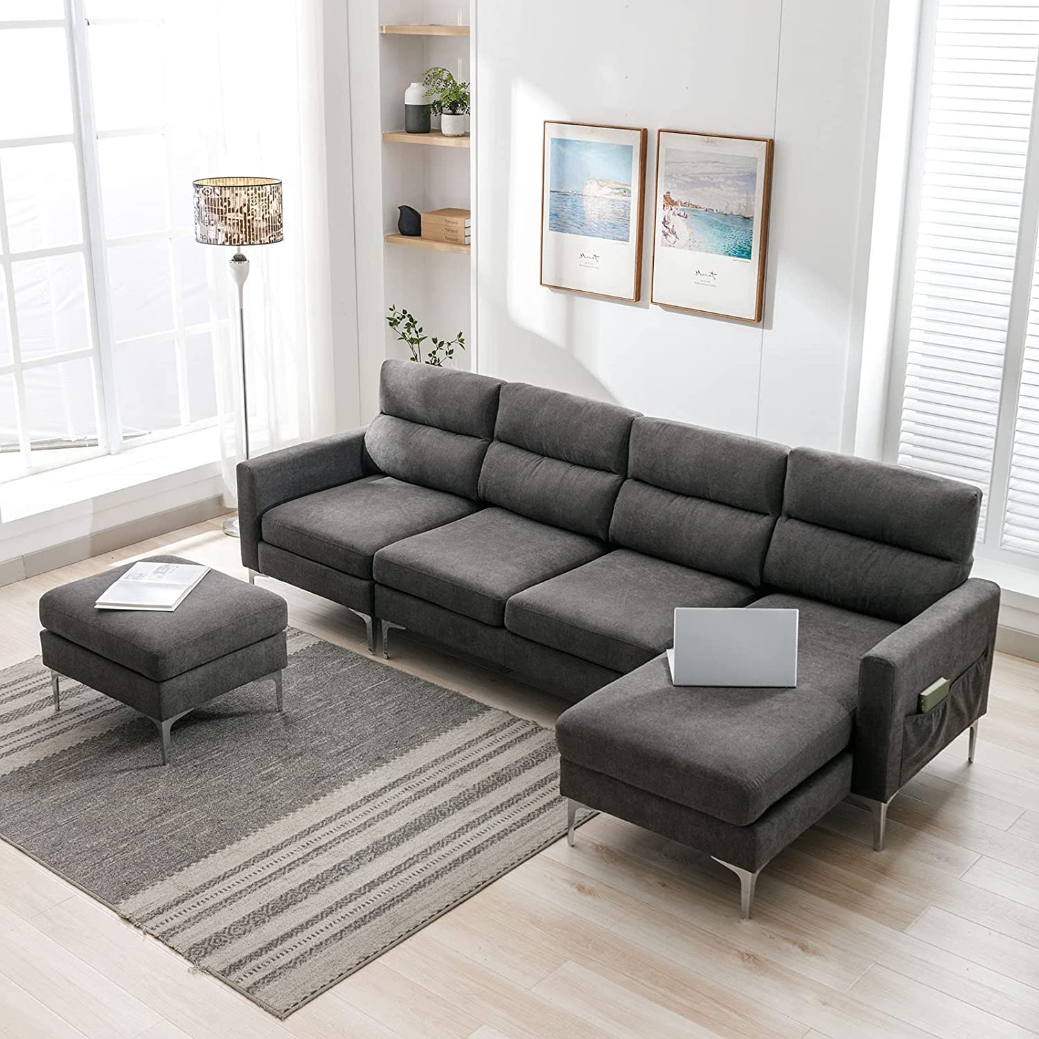 IPKIG 110" Convertible Sectional Sofa Couch, Modern Linen Fabric L-Shaped Couch 4-Seat Sofa Couch w/Reversible Chaise and Side Pockets for Living Room, Apartmentt (Grey)