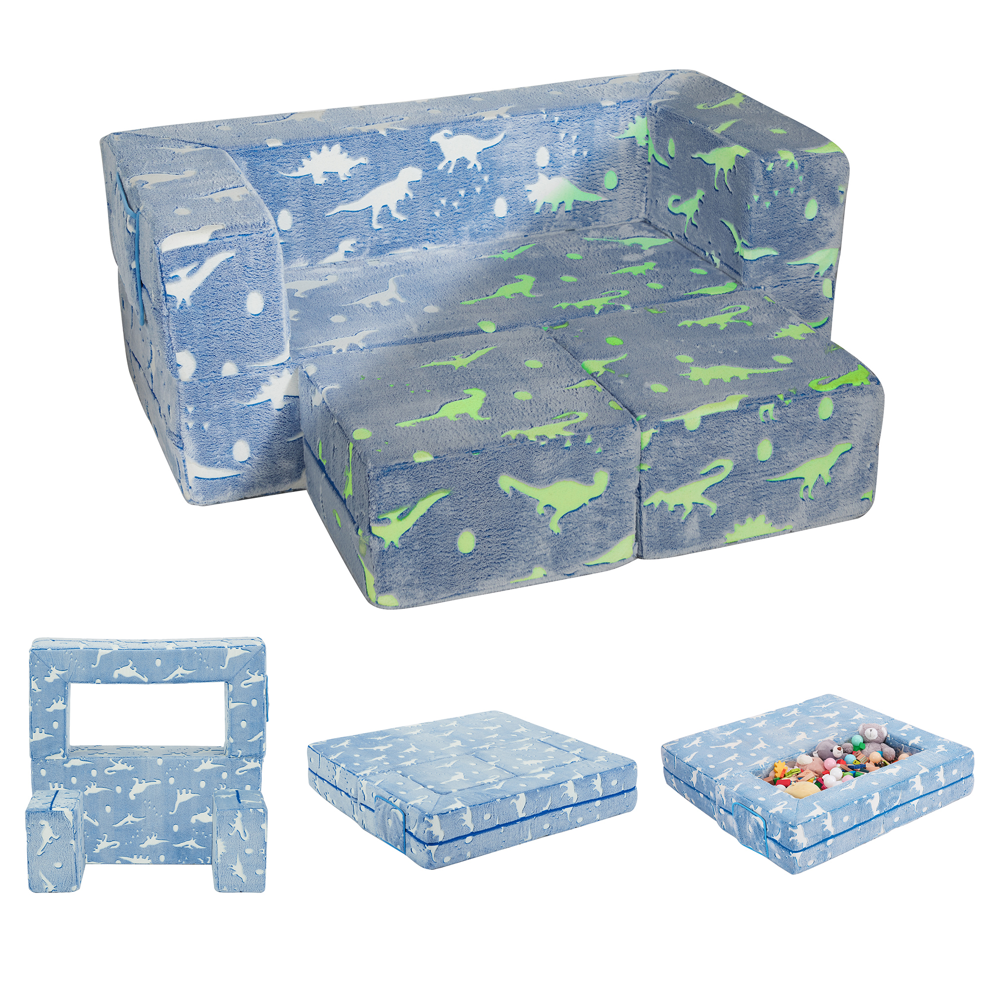 Ulax Furniture Kids Couch Modular Kids Sofa, Glow in the Dark Convertible Sofa for Toddlers and Kids Play Set Flip Out Lounger with 2 Ottomans for Playroom, Blue Dinosaur