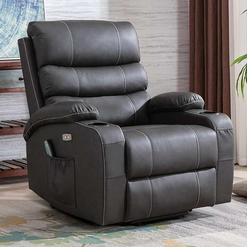 Electric Power Lift Recliner Chair, PU Leather Comfort Rocker Recliner Chairs Sofa for Adults, Dark Grey Dual Motor Lay Flat Chair with 2 Side Pockets, USB Ports, Remote Control for Living Room