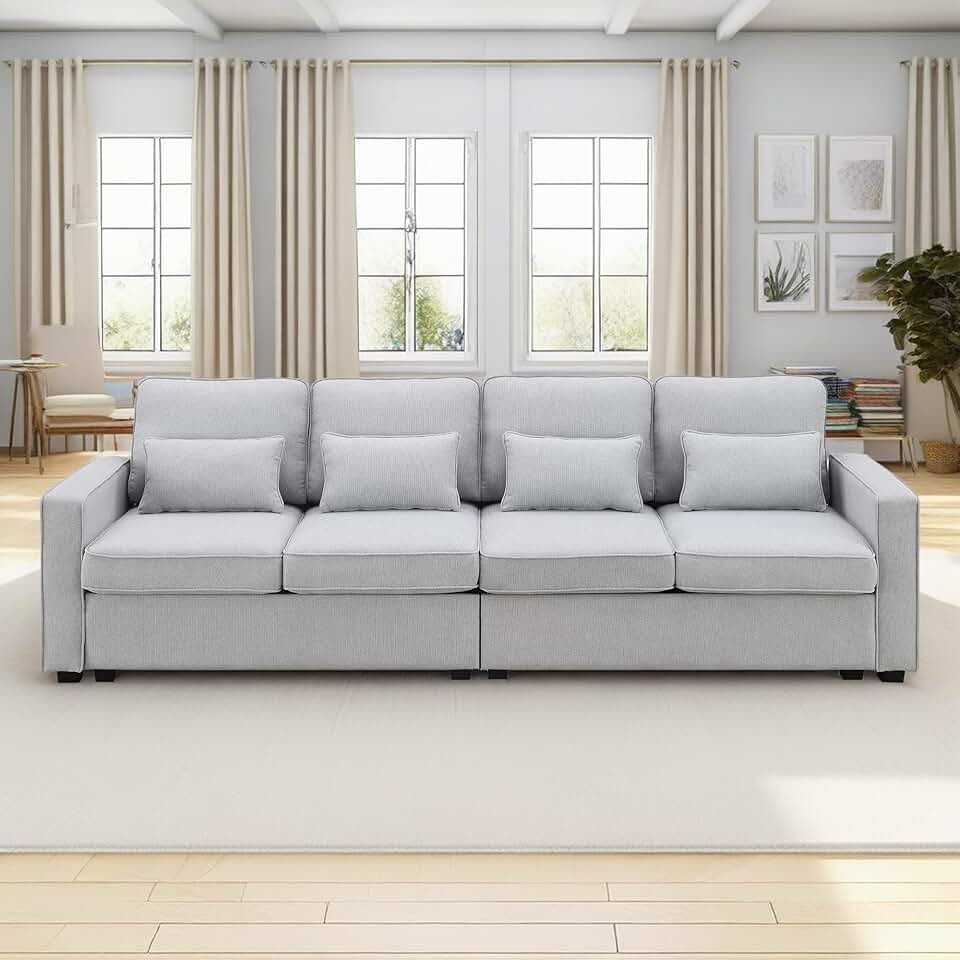 104" Linen Fabric Sectional Sofa, 4-Seat Upholstered Couch Set with Armrest Pockets and 4 Pillows, for Living Room Apartment Office