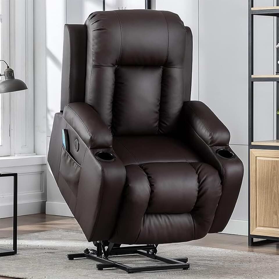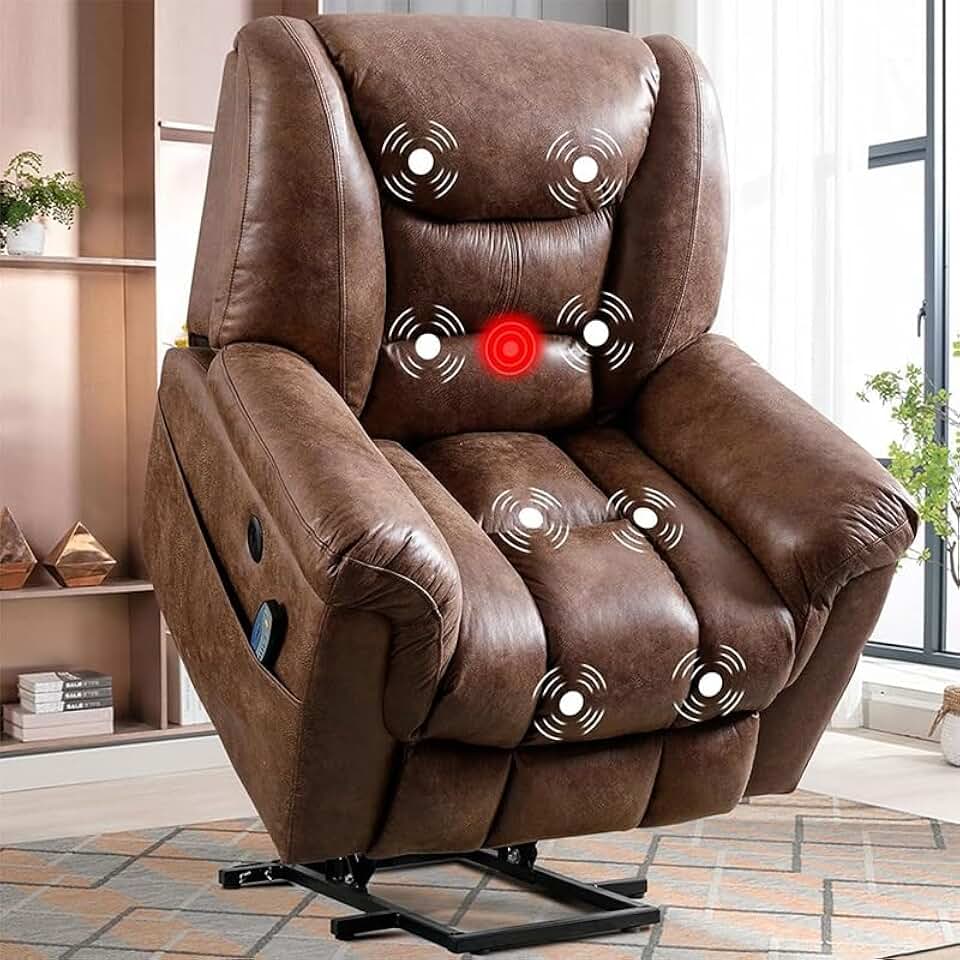 Brown Electric Large Lift Recliner Chair for Elderly, PU Leather Recliner Lift Chairs with Massage and Heated, Faux Leather Reclining Sofa with 2 Side Pockets, USB Ports, Remote Control for Living Roo