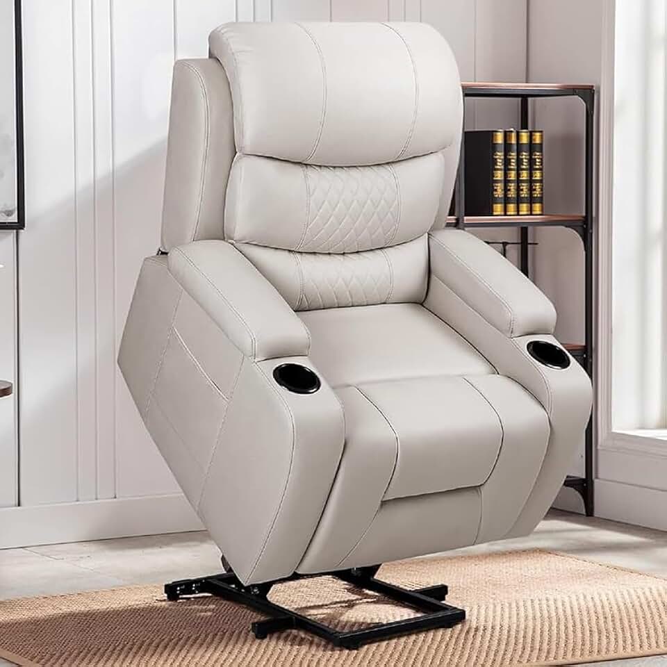 Electric Lift Recliner Chairs for Elderly, PU Leather Beige Power Recliner Sofa Lift Chair, Home Theater Reclining Sofas Chairs with Massage and Heated for Living Room Office