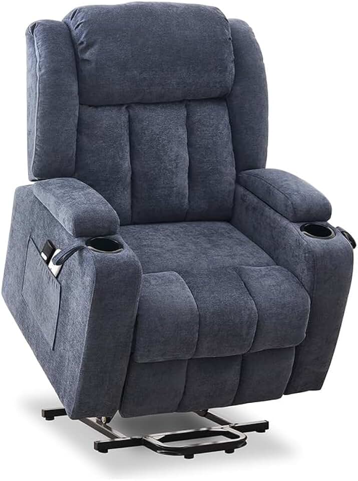 Electric Power Lift Recliner Chair for Elderly, Fabric Blue Recliner Chairs with Massage and Heated, Living Room Recliner Sofas with 2 Side Pockets, and Cup Holders
