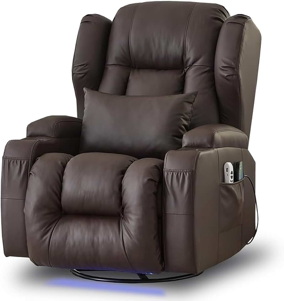 Elderly Electric Recliner Chair, Home Theater Seating Single Sofa with LED Light, Faux Genuine Leather 360° Swivel Rocking Chairs for Living Room with Remote Control, 2 Side Pockets, and Cup Holders