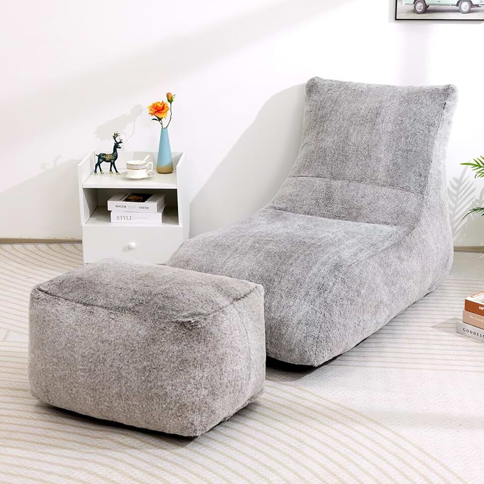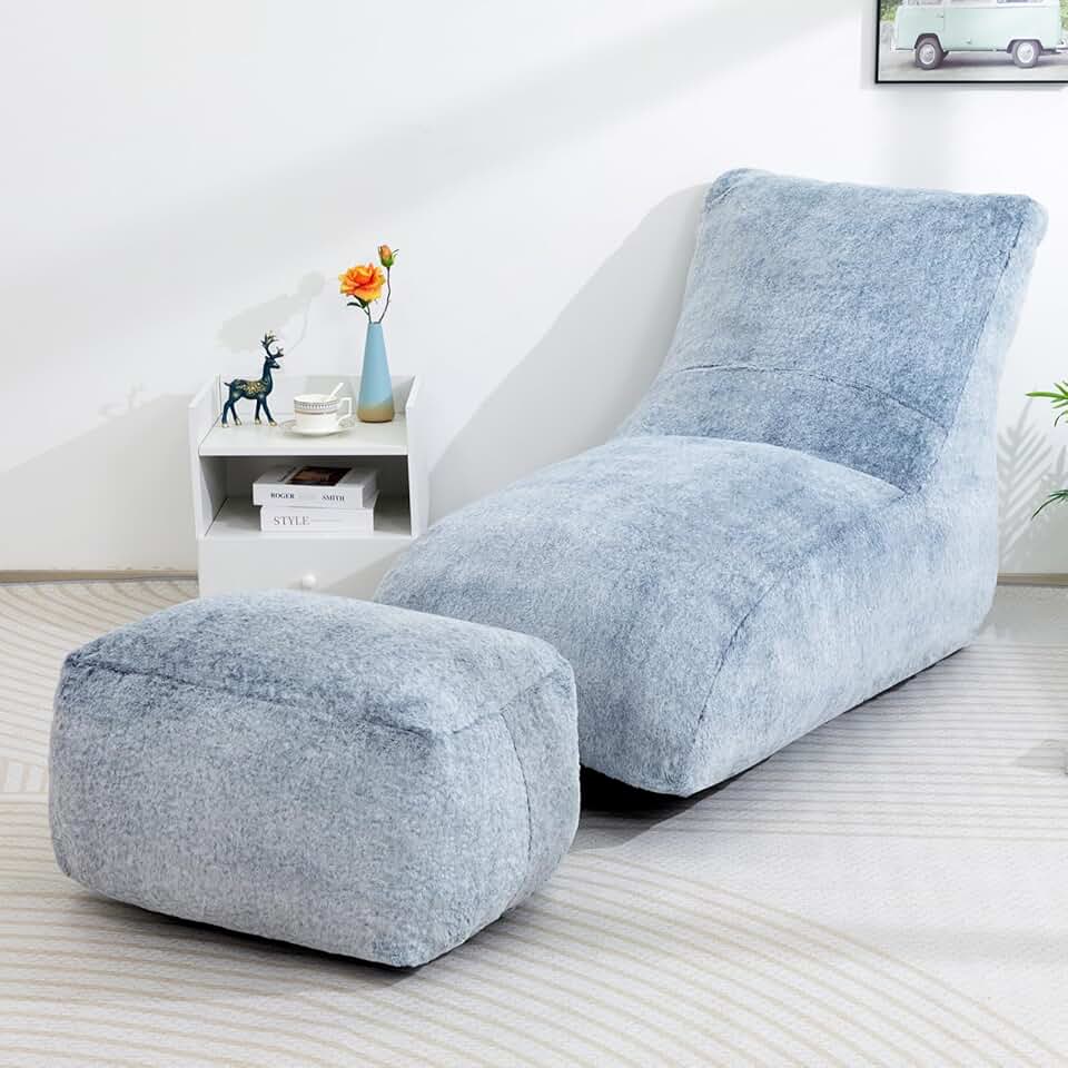HollyHOME Accent Furry Bean Bag Chair and Ottoman, 30LB Zero-Gravity Chaise Lounge Chair for Adults, 6.6LB Memory Foam Filled Lounge Stool, Memory Foam Bean Bag Sofa Sack and Footrest Stool, Blue&Grey