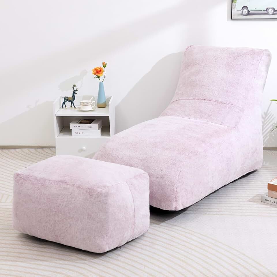 HollyHOME Accent Furry Bean Bag Chair and Ottoman, 30LB Zero-Gravity Chaise Lounge Chair for Adults, 6.6LB Memory Foam Filled Lounge Stool, Memory Foam Bean Bag Sofa Sack and Footrest Stool, Coffee