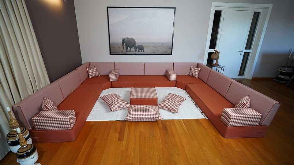 Linen Bench Cushion, Moroccan Sofa Set, Arabic Majlis, Turkish Floor Sofa, Floor Seating, Sofa Set Living Room, Arabic Couches (8'' Thickness Sofa, U Sofa + Ottoman + Pillows)
